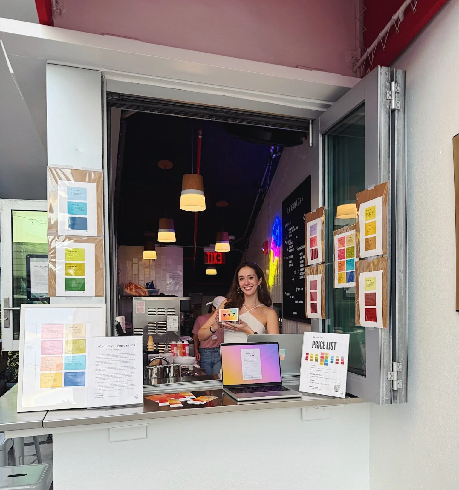 As the culmination of a 4 day Artist’s Residency at The Betsy Hotel, The Color Rx: Ventanita was a one night pop up experience in Miami, FL as part of Art Week 2025. It happened at The Betsy Hotel’s ice cream Ventanita, and allowed participants to tell the algorithm how they were feeling, receive a prescriptive Color Rx™ paint chip, and shop prints!