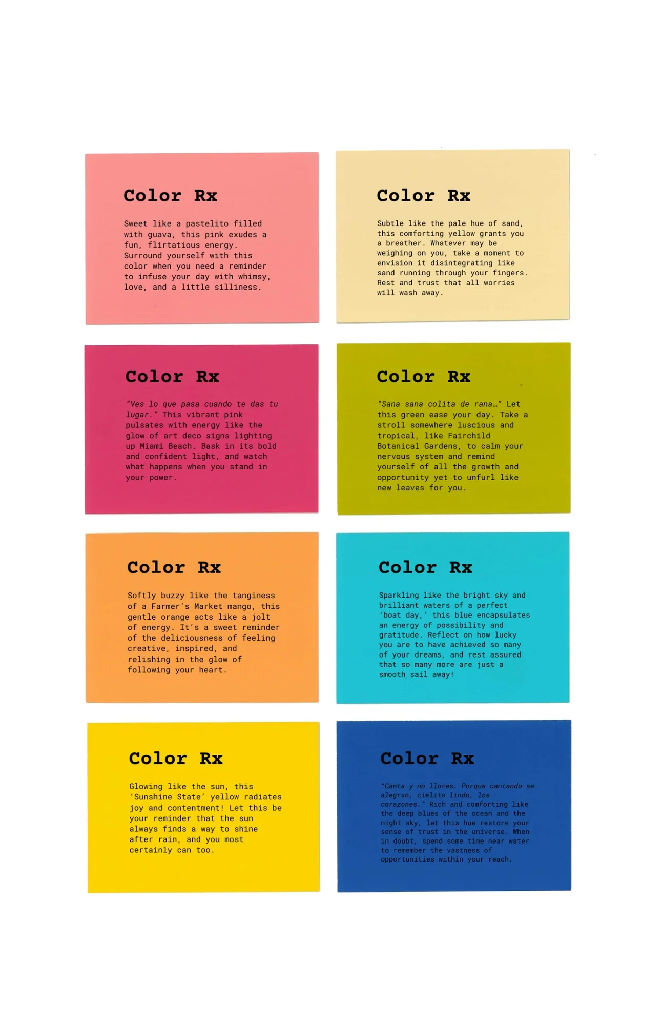 A print of eight, hand-selected Color Rx chips in a Miami, FL specific palette to provide a weekly dose of mood boosts based on the 305 — exclusively designed to celebrate Art Week 2025.
